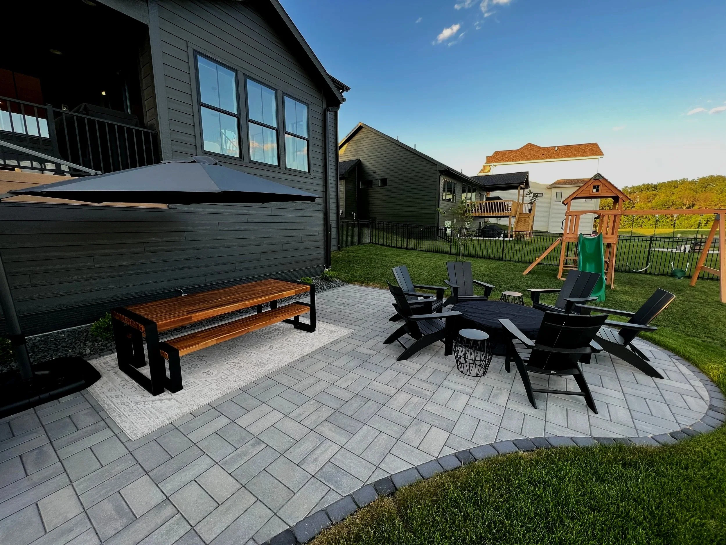 From there, we work with you to select paver styles, colors, and layout patterns that complement your home. We often incorporate a contrasting border course to frame the space and define the design, paired with a thoughtfully chosen main field pattern for visual depth and balance.